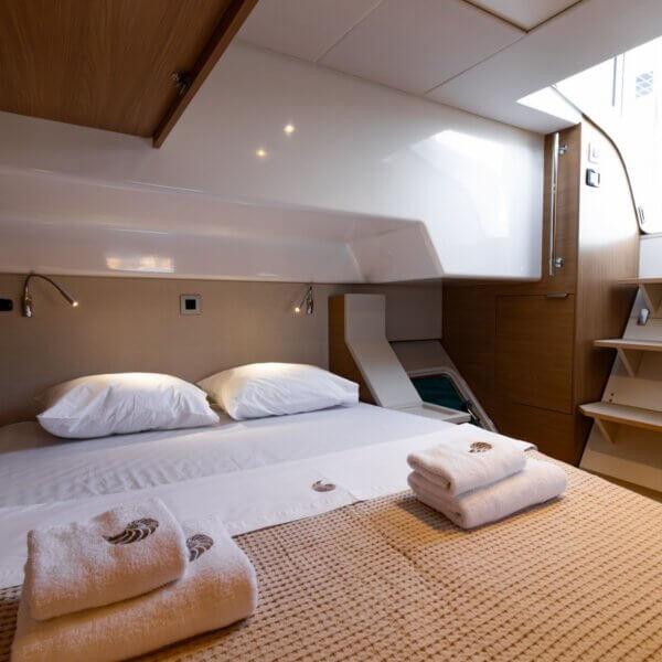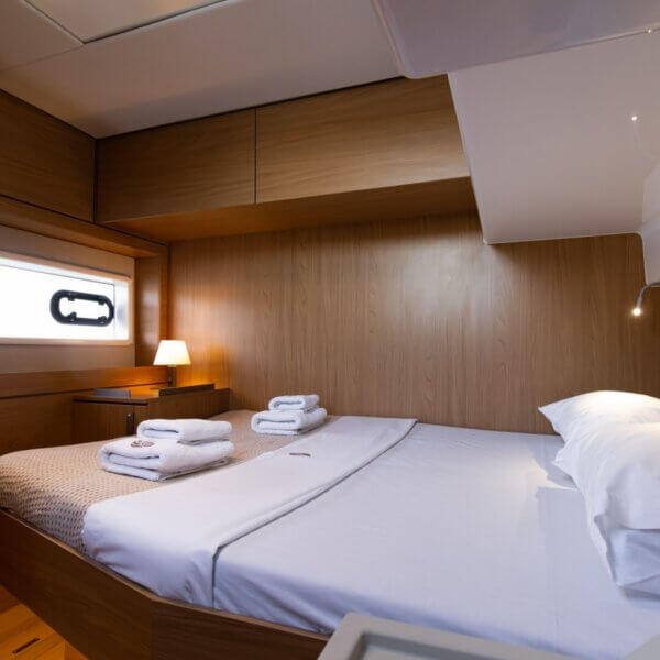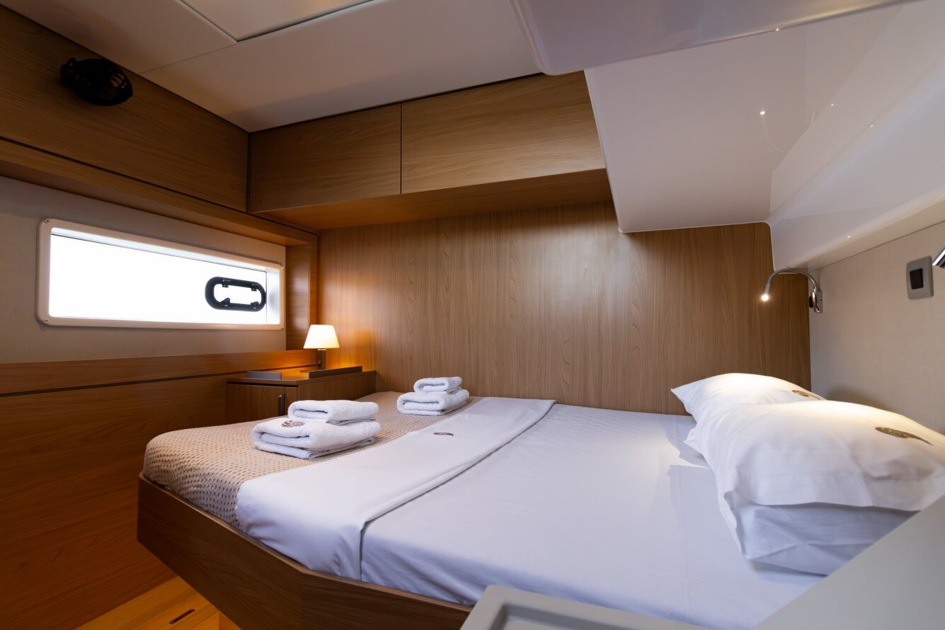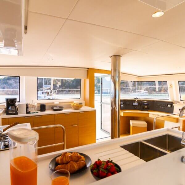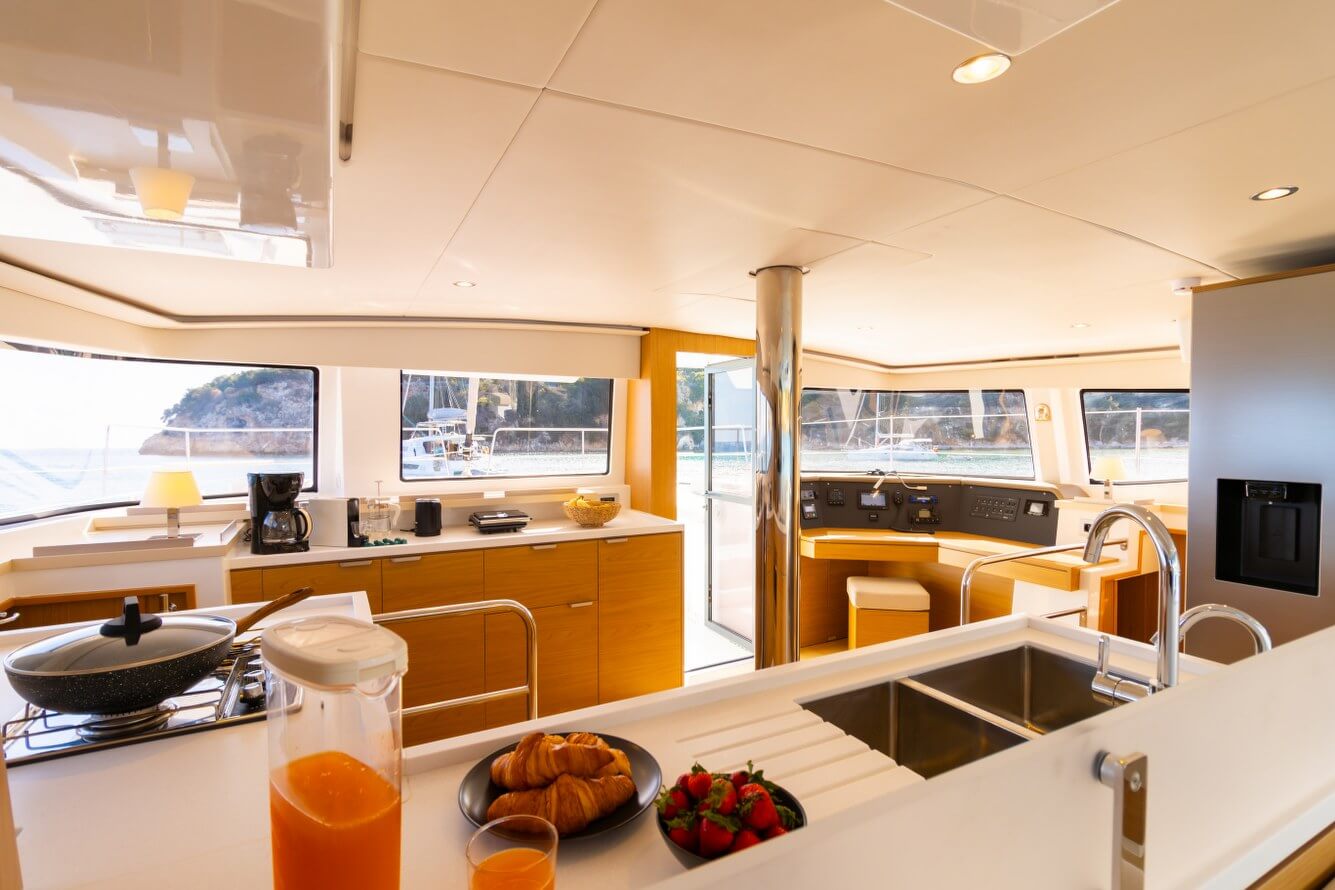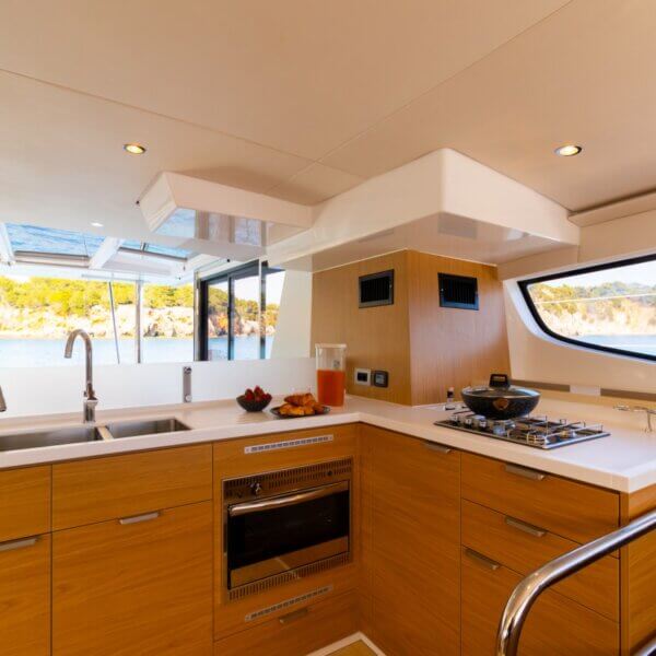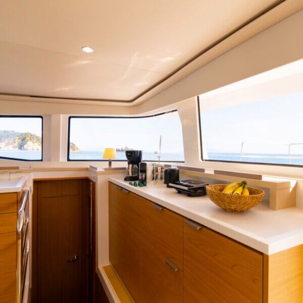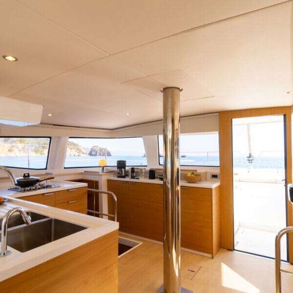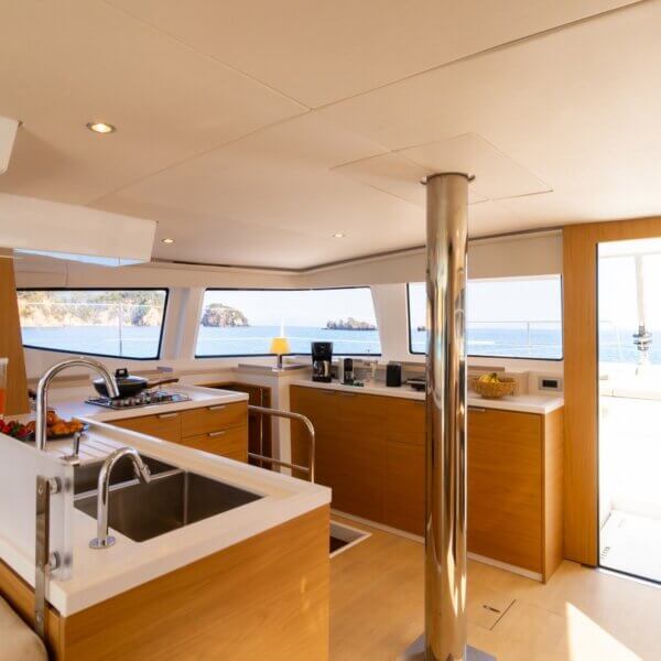 Designed for long-term voyages, the Bali 4.6 catamaran offers 95 m² of comfort and space, with a design by Piaton&Bercault. The huge Open Space accommodates a U-shaped galley, a saloon for 10 guests and a very large sofa. A dream at sea for your faraway destinations!